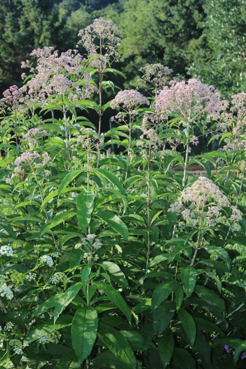 Native to the Eastern half of the US, Hollow Joe Pye Weed will surpass the Midwest-native Eupatorium maculatum by about 1′. Also known as Tall Joe Pye Weed, Trumpetweed.